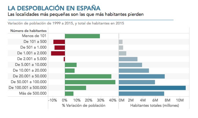 El gráfico de arriba obtenido del periódico El Confidencial no hace más que refutar este éxodo de los pueblos pequeños de España y el crecimiento de las ciudades con mayor número de habitantes.