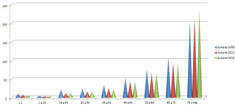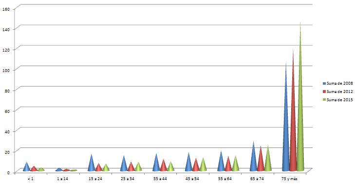 En primer lugar es importante clarificar el rango de edades donde se produce la mayoría de las muertes anuales. Este gráfico representa por rangos de edad las muertes en España por cada 100000 habitantes en tres años. Fácilmente se puede deducir que el mayor riesgo aparece a partir de los 75 años en adelante.