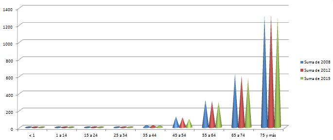 Por otro lado, analizando geográficamente las muertes en España, a partir del gráfico que hemos obtenido podemos asegurar que las comunidades autónomas que tienen mayor índice de mortalidad son las situadas en el norte de España, Asturias, Galicia, Castilla y León o Cantabria durante los años 2008, 2012 y 2015. No se aprecian variaciones relevantes entre años en ninguna comunidad autónoma. El estudio se ha realizado en una muestra de 100000 habitantes.